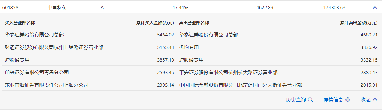 5月30日,中国科传今日涨停,龙虎榜数据显示,上榜营业部席位全天成交3.62亿元,占当日总成交金额比例为20.77%。其中,买入金额为1.95亿元,卖出金额为1.67亿元,合计净买入2719.51万元。
