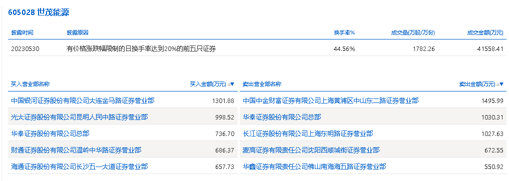 5月30日,世茂能源今日涨停,龙虎榜数据显示,上榜营业部席位全天成交9158.57万元,占当日总成交金额比例为22.04%。其中,买入金额为4381.18万元,卖出金额为4777.39万元,合计净卖出396.21万元。