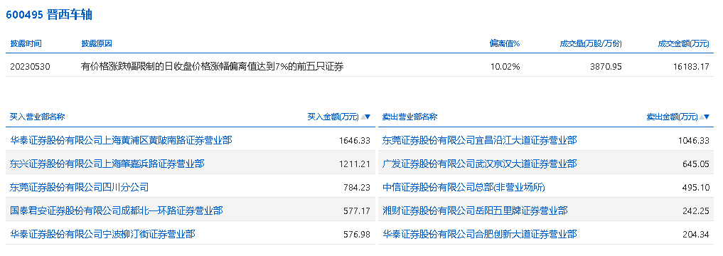 5月30日,晋西车轴今日涨停,龙虎榜数据显示,上榜营业部席位全天成交7428.98万元,占当日总成交金额比例为45.91%。其中,买入金额为4795.92万元,卖出金额为2633.07万元,合计净买入2162.85万元。