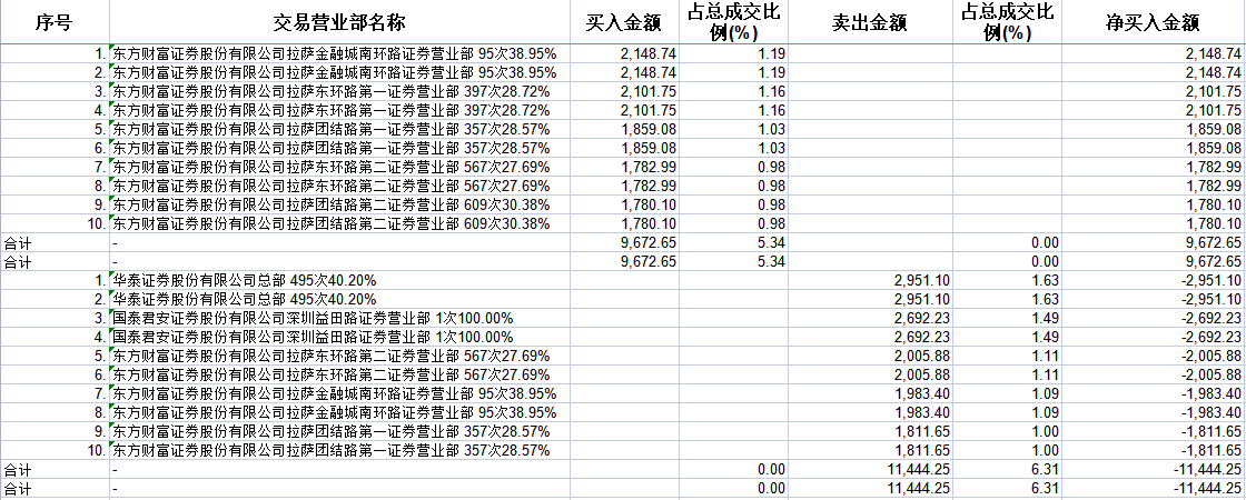 具体来看,东方财富证券拉萨金融城南环路证券营业部、东方财富证券拉萨东环路第一证券营业部分别买入2148.74万元、2101.75万元;华泰证券总部、国泰君安证券深圳益田路证券营业部分别卖出2951.10万元、2692.23万元。