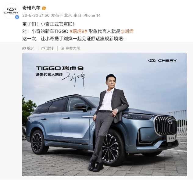 奇瑞汽车官宣刘烨为瑞虎9形象代言人