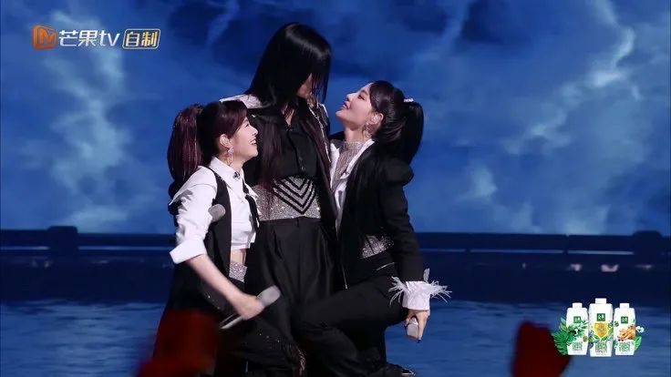 舞台pose设计也是前面各种混乱剧情,后面大家抱在一起“姐妹贴贴”。谢娜的《龙拳》想走出吴君如《洪兴十三妹》的感觉,但她那牛皮哄哄的样子在长沙解放西干群架都只有输的份;龚琳娜的《迷迭香》提着个行李箱与队友会合,宛如民国谍战剧的接头活动;《开往早晨的午夜》ending 时三人搂在一起,张嘉倪和徐怀钰宛如赵丽娜身上的两个小挂件。