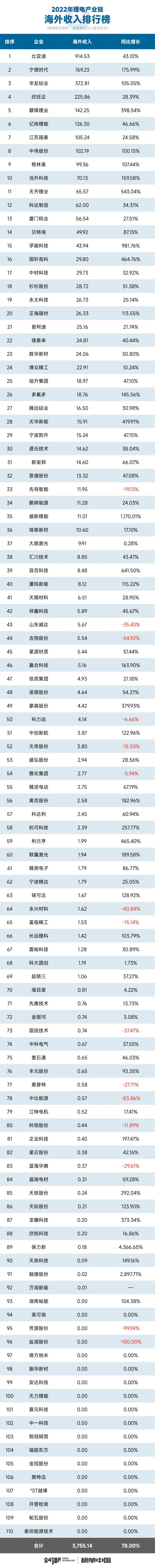 此外,据24潮统计,其中前20名企业2022年海外收入合计为3347.17亿元,占比高达89.14%。其中8家企业海外收入规模突破100亿元大关,比亚迪、宁德时代与华友钴业高居榜单前三名;前20名企业2022年海外收入全部实现20%以上速度增长,其中海外收入增长最快的三家企业依次为:贝特瑞-同比增长981.76%,当升科技-同比增长543.04%,孚能科技-同比增长464.76%。