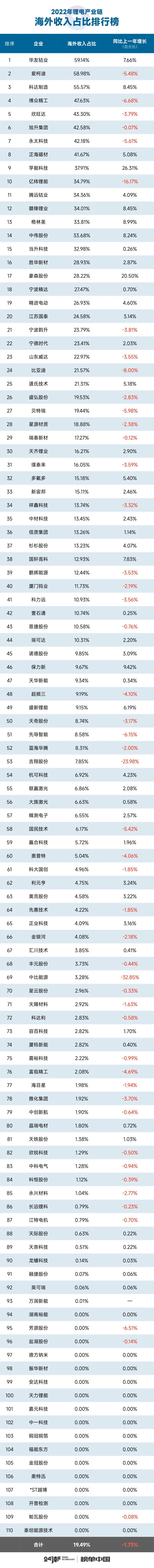 在所有锂电上市公司中,2022年只有三家企业海外收入占比超过50%,他们是华友钴业-海外收入占比59.14%,爱柯迪-海外占比58.98%,科达制造-海外占比55.57%。