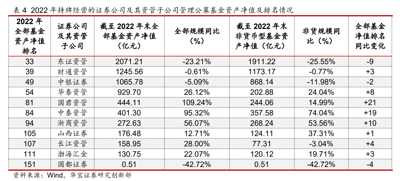 截至2022年末,券商旗下公募基金数量达360只,合计规模6896.97亿元,同比增长1.55%,其中非货规模5347.34亿元,同比下降7.22%,国君资管、中泰资管、浙商资管2022年公募产品规模增幅50%以上。