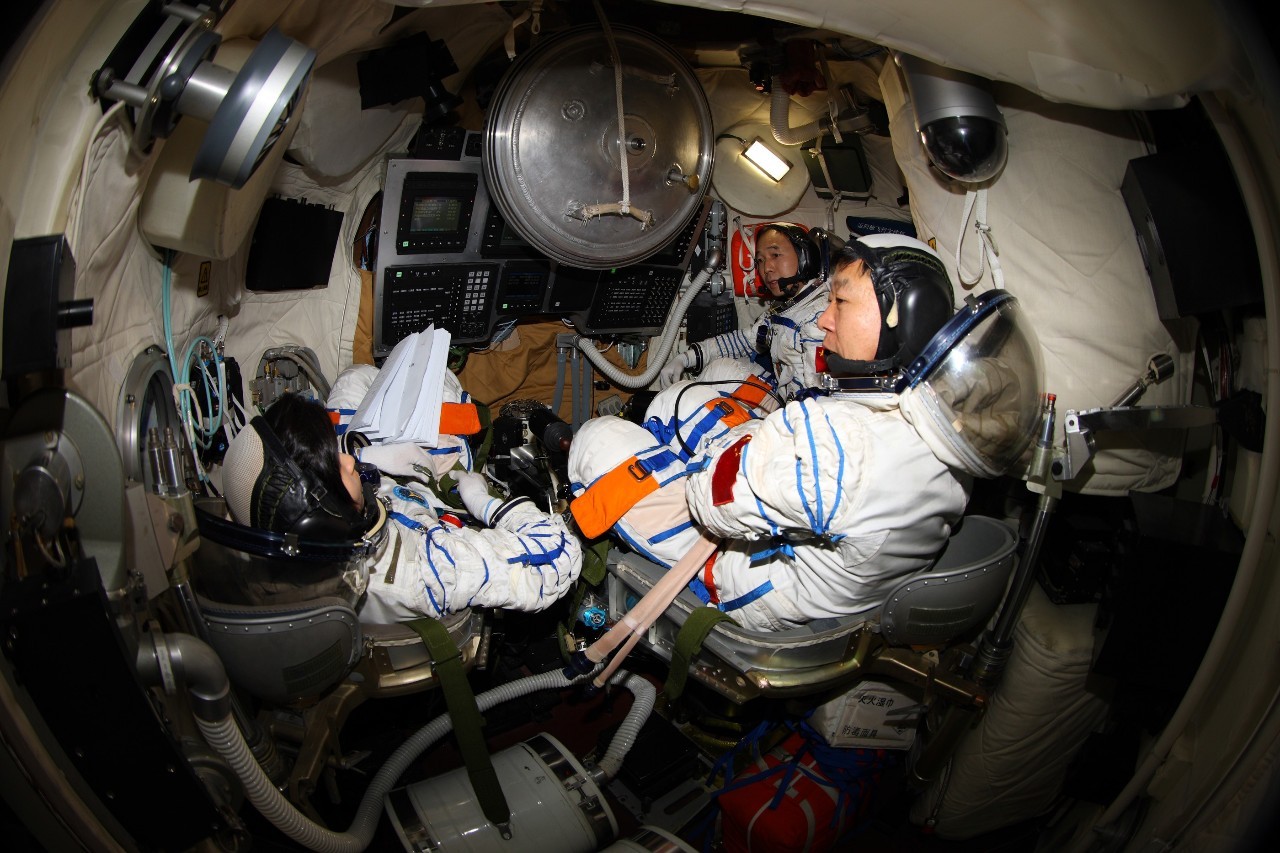 神舟-9航天员乘组景海鹏、刘旺、刘洋在返回舱进行手控交会对接训练