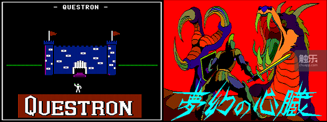 《the CRPG Book Project》一书的作者Felipe Pepe在Gamasutra上举了两个很好的例子作为对比,下面是两款1984年产RPG的标题画面。左边是美国Apple Ⅱ上的《魔界神兵》(Questron),右边是日本PC-8801上的《梦幻的心脏》(Heart of Fantasy ):