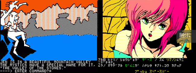 同样的,下面是两款早期文字冒险游戏的静止图像:左边是雪乐山《Hi-Res Adventures》系列的《黑水晶》(The Dark Crystal),右边是艾尼克斯的《ザース》(Zarth),都是1983年的游戏。