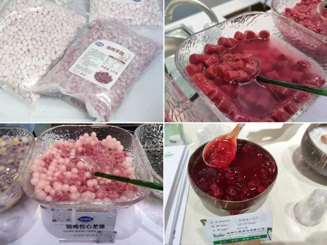 比如,伴随杨梅冰汤圆走红全国大小夜市,展会上的杨梅产品也多了起来,杨梅冰汤圆、杨梅包心龙珠、杨梅味丸子、杨梅果肉爆爆珠等特色小料成为热门。在杨梅外,百香果、芭乐、火龙果、水蜜桃等果味也被一一被呈现。