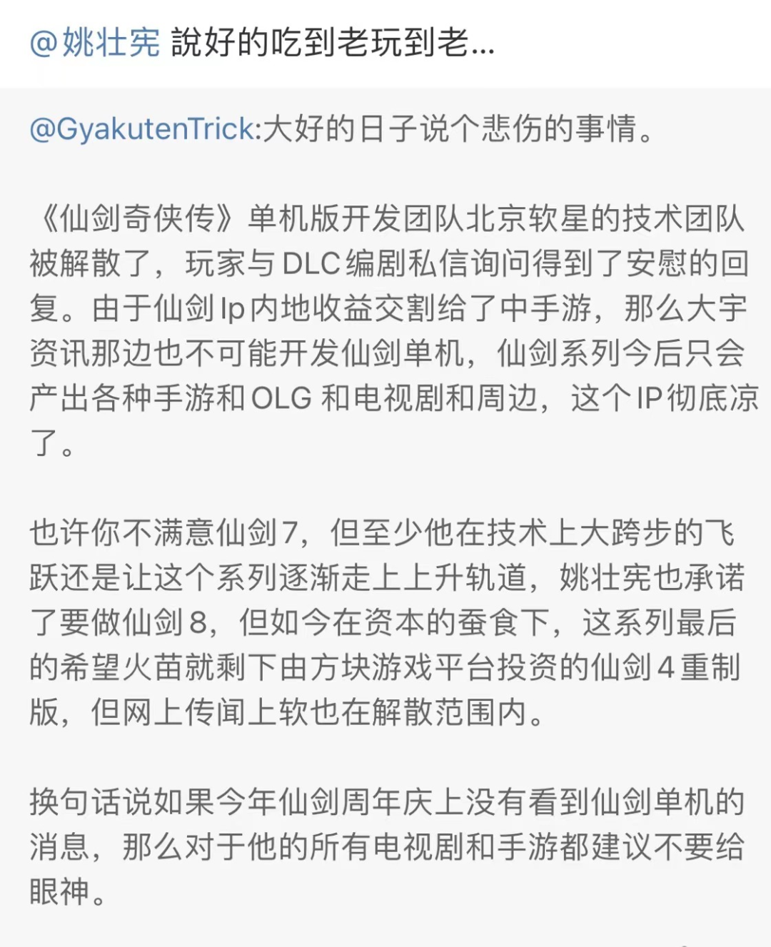 5月14日早间,由微博账号@GyakutenTrick发布消息称:《仙剑奇侠传》单机版开发团队北京软星的技术团队被解散,IP系列单机将凶多吉少。晚间,曾经同为《仙剑1》狂徒制作组组长谢崇辉的”内涵"转发,并圈中姚壮宪(仙剑系列制作人)说”说好的吃到老玩到老……”。这条信息出现之后,在微博、贴吧、论坛等社群引起一阵波澜,也让众多仍抱有情怀的玩家内心五味杂陈。