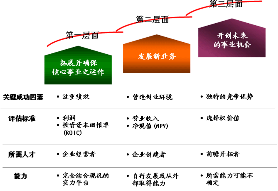 麦肯锡资深顾问梅尔达德·巴格海和斯蒂芬·科利、戴维-怀特通过对世界上不同行业的40个处于高速增长的公司研究后,在《增长炼金术——持续增长之秘诀》中提出所有不断保持增长的大公司的共同特点都是保持三层面业务的平衡发展。