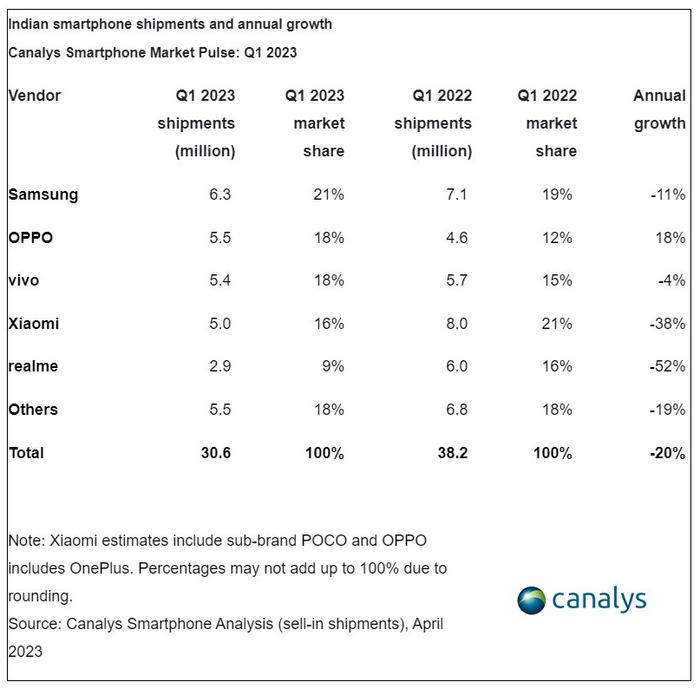 印度市场的情况与中国市场相似。在一季度,小米排在印度市场的第四名,之前一直是第一名。据Canalys,小米一季度在印度市场的出货量为 500 万台,同比下降 38%。