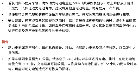 蔚来的提醒如下图,说的比较笼统,也是建议长时间不使用电池,则需要将电池电量保持在50%以上,并且最好每个月都要使用一下汽车。