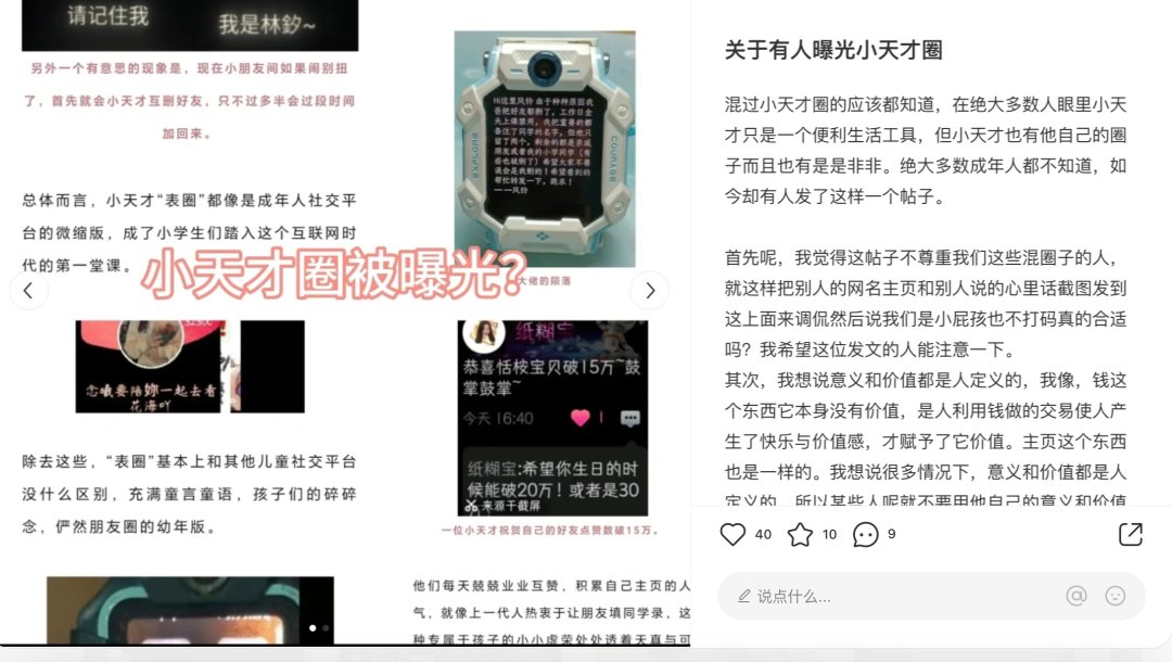 在成年人的社交平台上,搜索小天才、华为等智能手表的评测,只能看到家长们围绕孩子教育约束的讨论,但只要换一个关键词——小天才混圈,则会看到另一个不同的世界,这是天天戴着智能手表的孩子们的话题场。