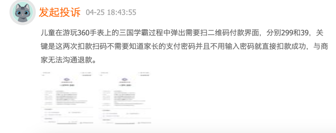 品牌对用户的拉拢既面向家长,也面向孩子。在智能手表的部分App和游戏里,一些付费漏洞可以让孩子在不经家长许可操作的情况下付费。黑猫投诉平台上,不乏对智能手表莫名扣款的投诉,查询源头,皆是孩子在无需密码的操作中扣费。