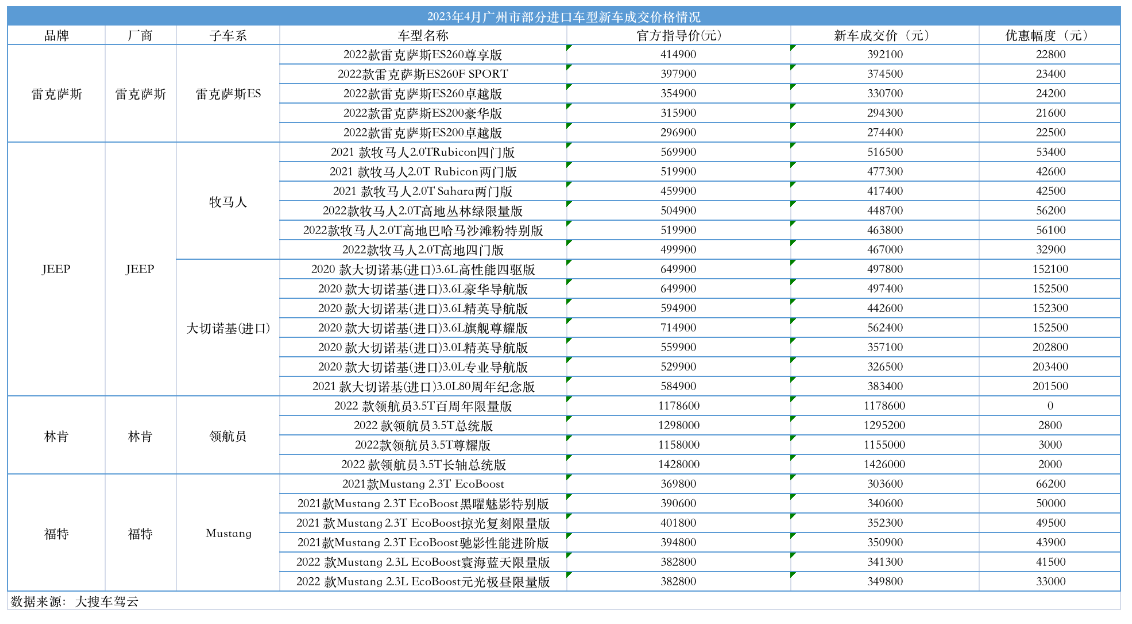 不止雷克萨斯,多个进口车品牌的价格都有一定程度的下降。大搜车智云的数据显示,2023年4月份,Jeep、林肯、福特旗下的多款进口车型新车成交价低于同期官方指导价。