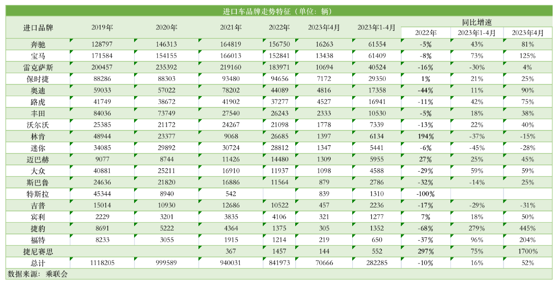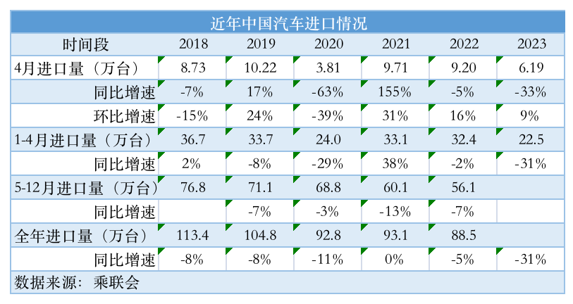 进口车市场正在整体降温。乘用车市场信息联席会秘书长崔东树发布的数据显示,2023年4月,汽车进口量6.19万台,同比下降33%。