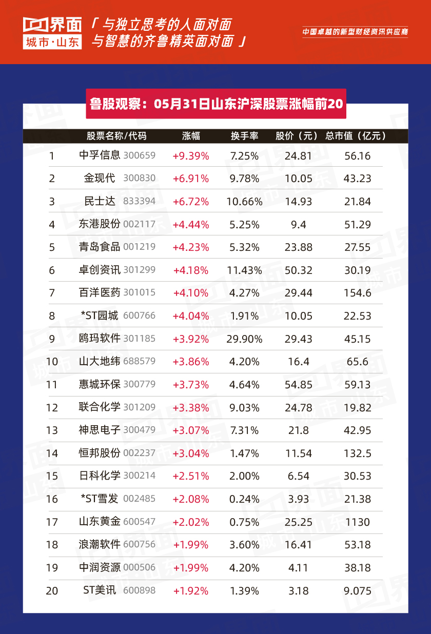 济南市涨幅榜首:中孚信息(300659),涨幅:9.39%,股价24.81元,总市值56.16亿元;
