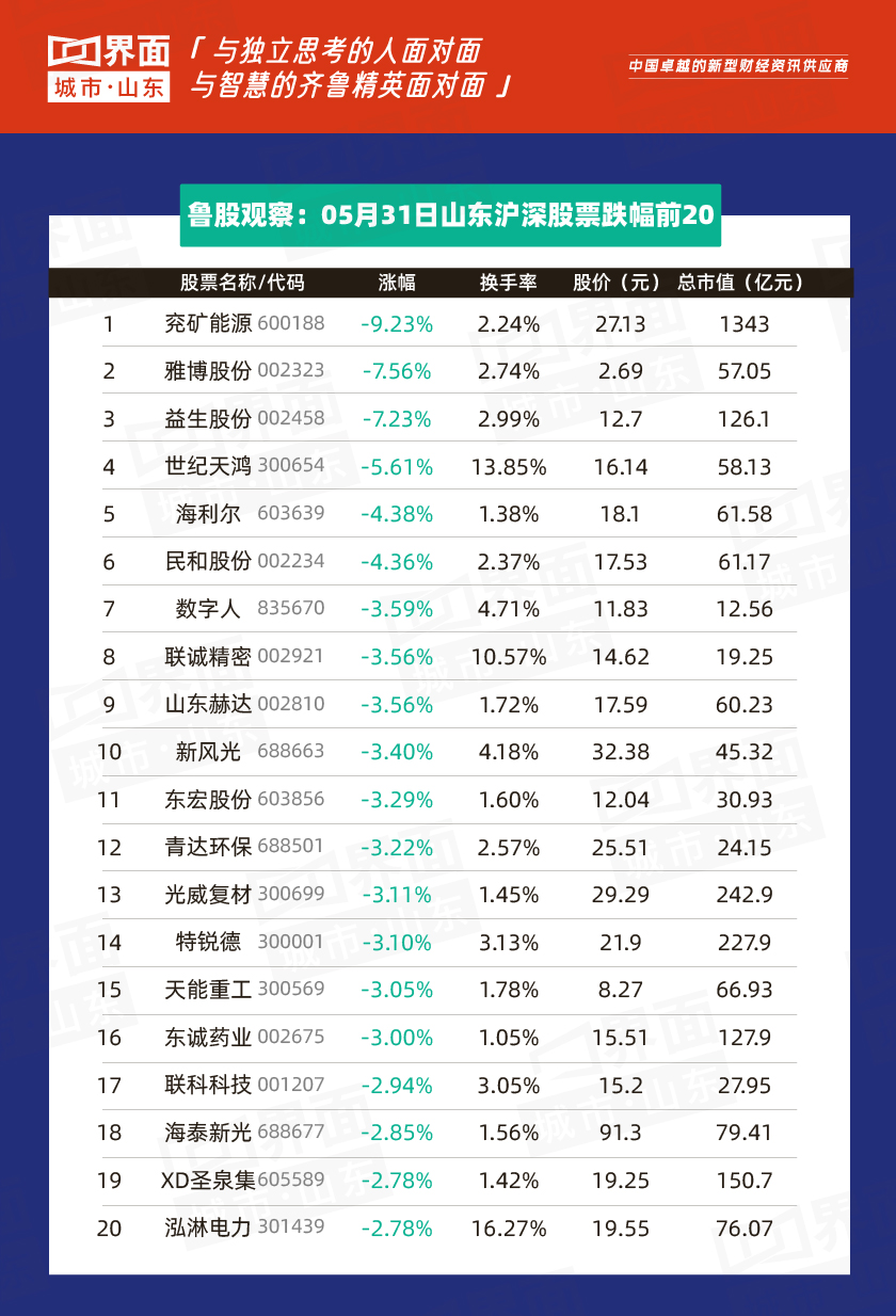 2.跌幅榜首:兖矿能源(600188),跌幅:9.23%,收于每股27.13元;