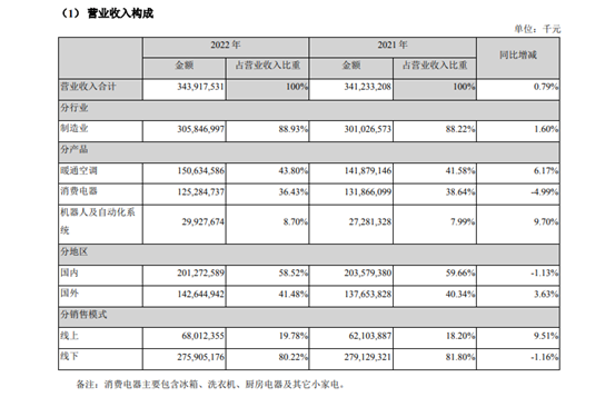 不过,美的也非高枕无忧。2022年,美的的暖通空调业务同比增长6.17%,占据同样地位的消费电器业务,营收同比下滑4.99%,这也是造成美的2022年营收增速处于0.7%的低位。