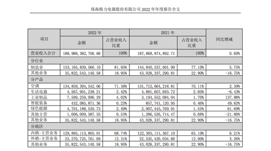 但从2022年财报来看,格力的多元化发展成效并不显著:其生活电器营收实现45.67亿元,同比下滑6.43%,占比营收2.6%。其后的工业制品、绿色能源、智能装备等营收占比更微不足道,仅为1.7%、1.55%、0.46%。