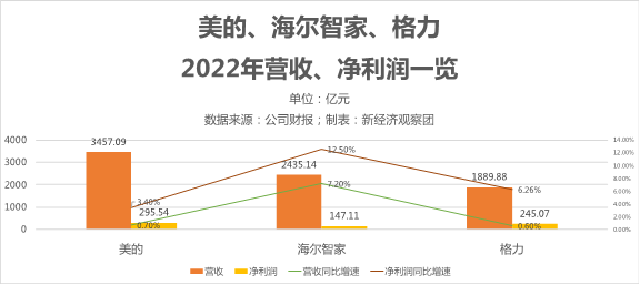 财报显示,2022年,美的实现营收3457.09亿元,同比增长0.7%;海尔智家实现营收2435.14亿元,同比增长7.2%;格力营收实现1889.88亿元,同比增长0.6%。同期,美的、海尔智家和格力的归母净利润和增速分别为:295.54亿元,同比增长3.4%;147.11亿元,同比增长12.5%;245.07亿元,同比增长6.26%。