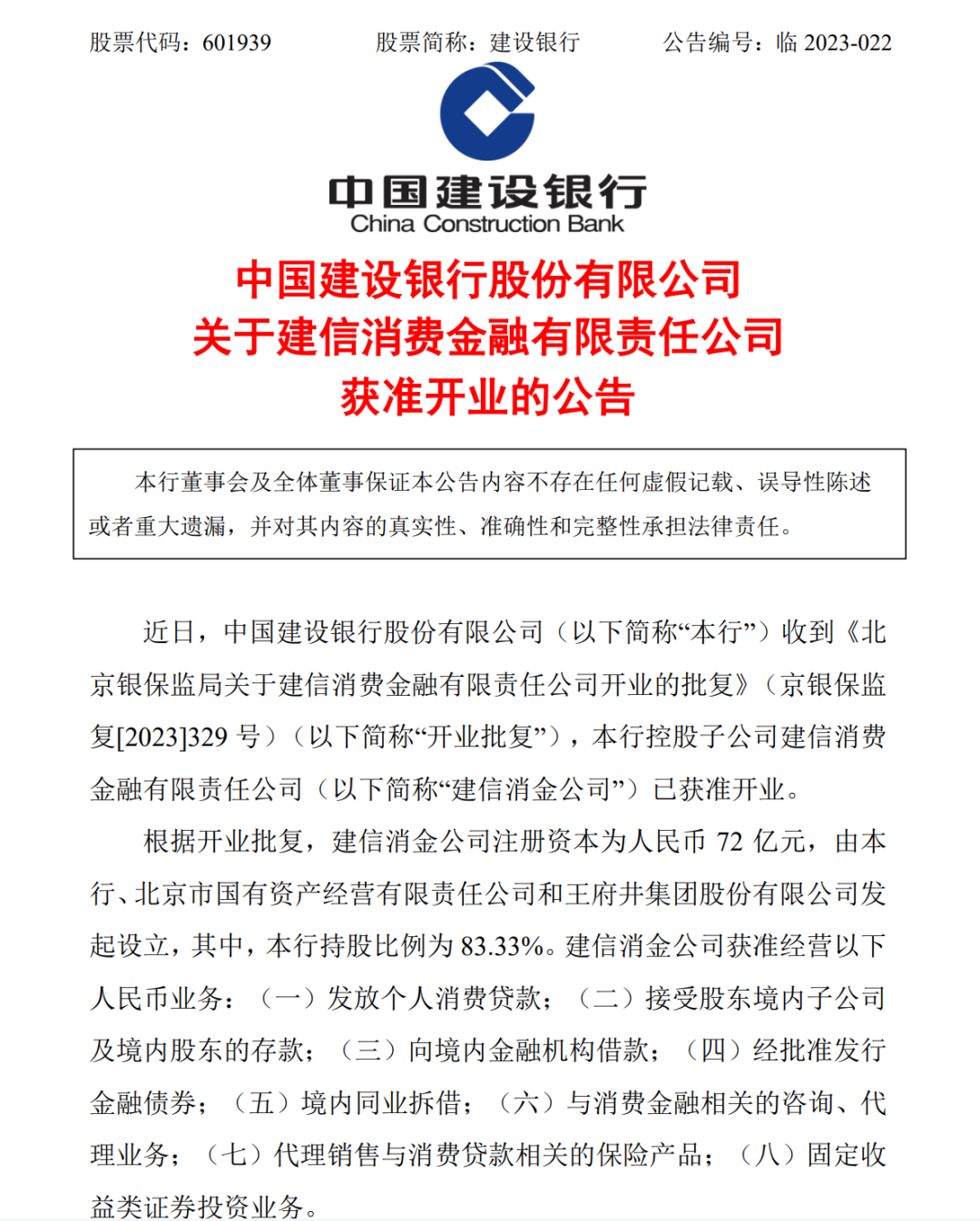 5月31日晚间,中国建设银行(股票代码:601939)发布了《中国建设银行股份有限公司关于建信消费金融有限责任公司获准开业的公告》(以下简称“公告”)。