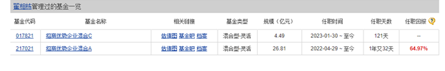 再如,基金经理翟相栋,累计任职时间1年又32天,在管规模31.29亿,在管2只产品中,有1只是2023年1月30日刚成立的,份额仅1.2亿份。