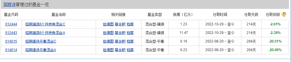 再如,基金经理阳宜洋,任职时间284天,在管规模13.09亿,旗下4只产品A/C,2只是2021年12月成立,2只是2022年1月成立,