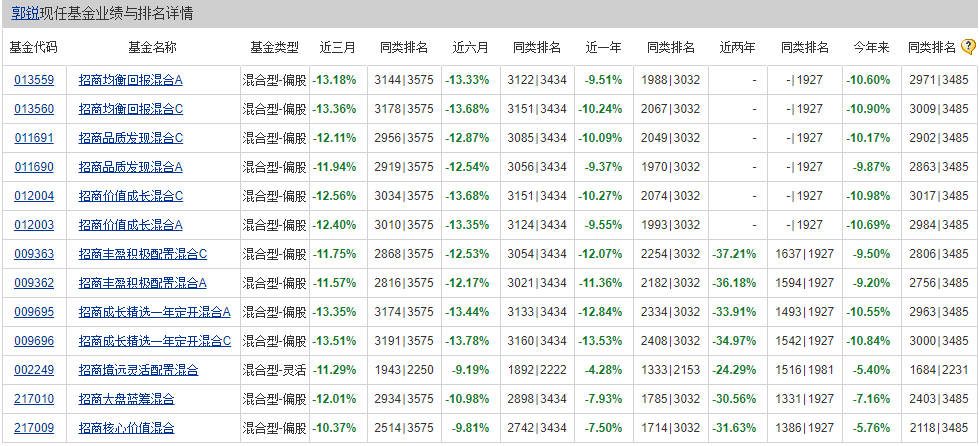 天天基金网显示,郭锐现任的13只基金,今年以来无一能实现盈利,且排名均在同行后列。