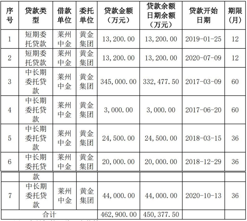 根据公告,截至2023年5月31日,如果上述提及的莱州中金债务仍未偿还,则大多数贷款已经逾期。其中,中长期委托贷款34.50亿元是贷款金额最高的一项,贷款自2017年3月9日开始,以期限60个月计算,到期日应为2022年3月9日。