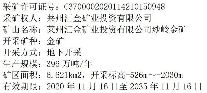 出现高增值率的主要原因是莱州汇金持有纱岭金矿采矿权。采矿权评估报告显示,纱岭金矿评估可采储量为7813.33万吨,金金属量246.81吨,平均品位3.16克/吨。评估报告采用折现现金流量法,评估得出纱岭金矿在评估基准日时采矿权评估价值为94.26亿元。目前莱州汇金仍在基建期,莱州汇金已经取得纱岭矿区采矿许可证。