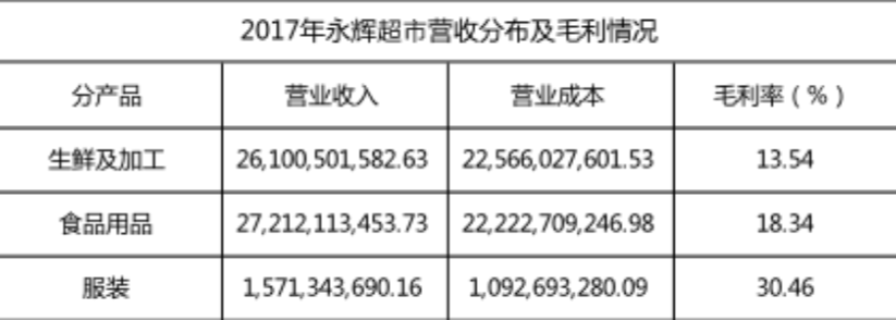 以2017年永辉超市的收入为例,服装类的毛利率达到30.46%,远高于生鲜及加工和食品类商品的毛利率,为永辉实现了接近5亿元的毛利。