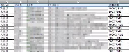 银行将活期余额超过800万的用户,称为七星级用户;超过1000万的,称为八星级用户。“填充的,也是银行客户数据,只是级别很低,冒充高星级用户。但购买数据的公司,很难鉴别真伪”,周晓青称,一份黑市价值3万的数据,经过填充后,他卖了20万。