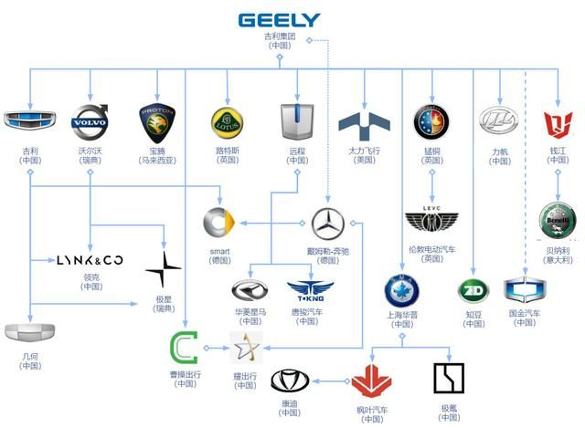 吉利系为例,在其品牌图谱中,有至少超过5个品牌来自于股权收购动作