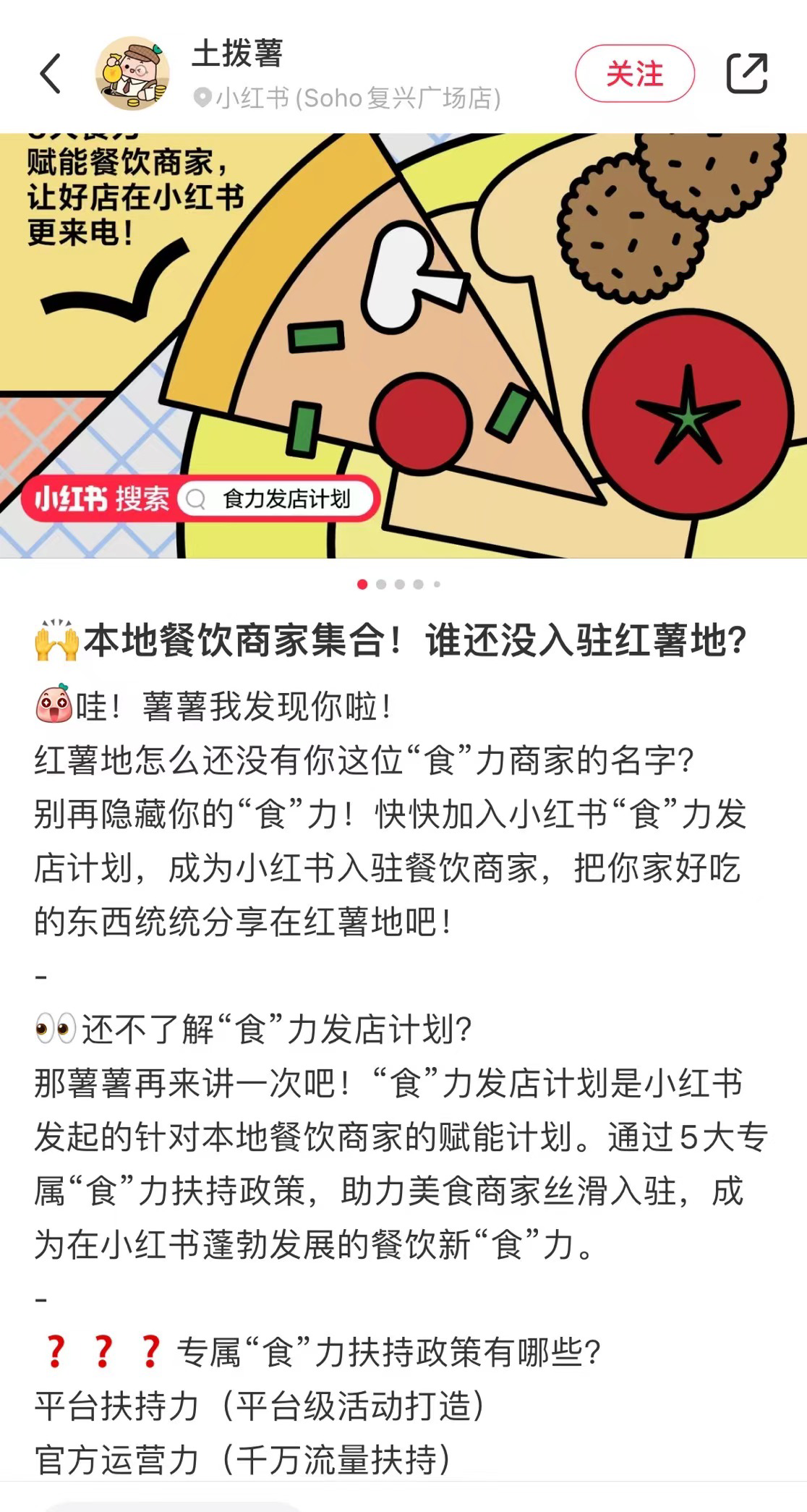 此外,平台已开设本地生活官方账号“土拨薯”,同时还推出了“食力发店计划”和“探照灯计划”。