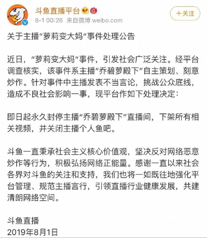 2019年,“萝莉变大妈”乔碧萝事件因引发社会热议,其账户也被封禁,并被列入中国演出行业协会网络表演(直播)分会的“黑名单”。据悉,被列入黑名单的主播将在行业内禁止注册和直播,封禁期限5年。