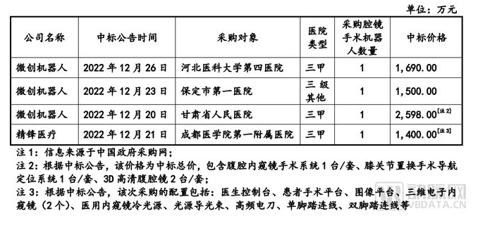 值得一提的是,4月13日,国家卫健委公布了新版配置大型医疗设备标准征求意见稿,对于配置腹腔镜手术机器人医院的要求从省级领先医院放宽到外科综合实力较强即可,配置门槛大大降低,预计未来将有更多医院能够安装手术机器人。