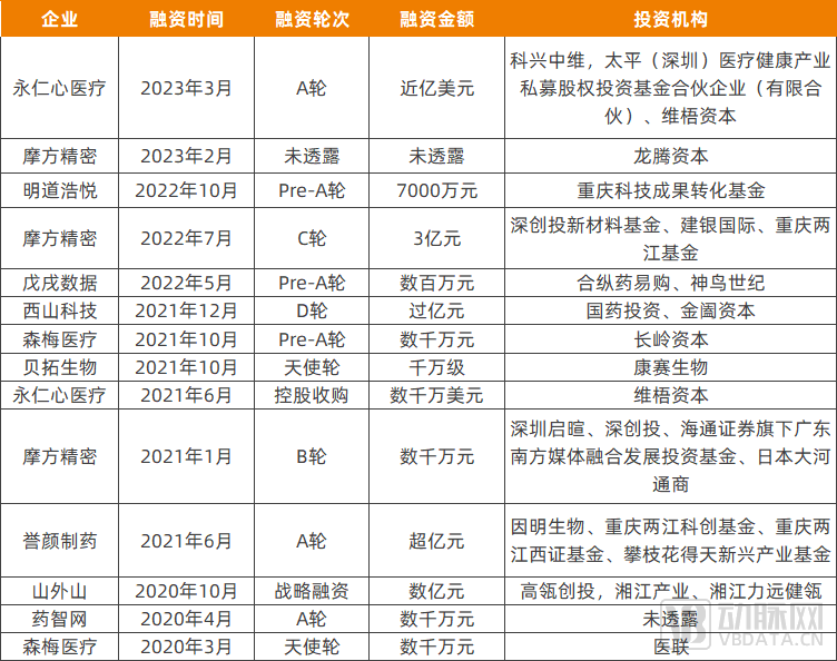 重庆部分企业融资情况(企业、机构披露),数据来源:动脉橙