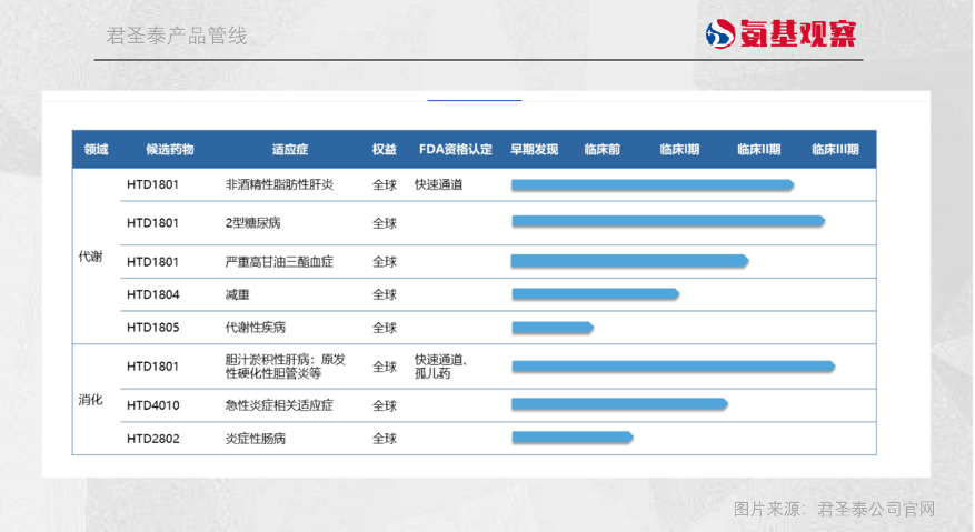 成立于2011年的君圣泰医药,主攻代谢和消化系统疾病。公司一共布局了5款候选管线,进度较快的是口服多功能小分子药物HTD1801及TLR4抑制剂HTD4010。