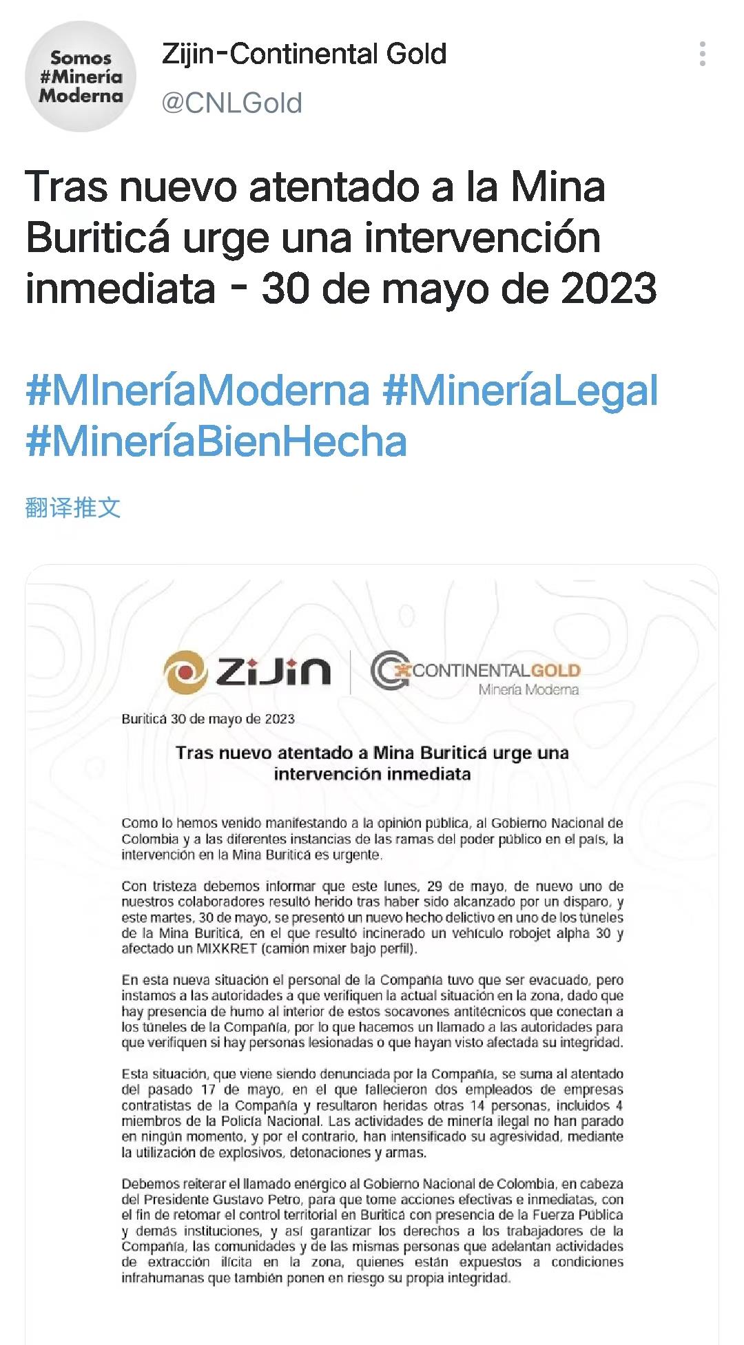 5月31日,紫金矿业控股子公司大陆黄金有限公司(下称大陆黄金)哥伦比亚分公司在推特上发布声明称,5月30日,武里蒂卡金矿遭到新一轮攻击,其中一辆型号为Robojet Alpha 30的车辆被火化,一辆混合车被烧毁。