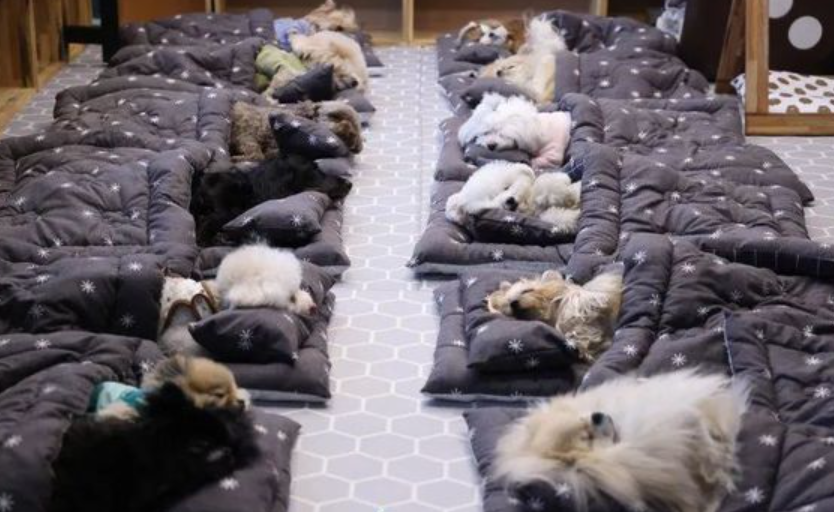比如,小狗们累了也会像小朋友一样睡午觉,并且每只小狗都有专属的床铺、被子和枕头。
