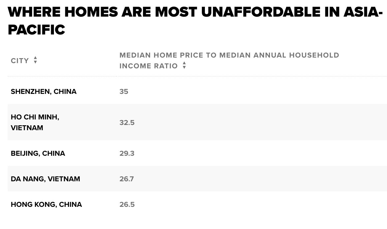 一般来说,当房价中位数与家庭年收入中位数之比超过5时,就被认为“负担不起住房”。按照这个标准,在此次调查的亚太地区45个城市中,只有新加坡的组屋、墨尔本和布里斯班的公寓是“负担得起的”。香港的这一数值为26.5,已比上一年(30.5)大幅下降。