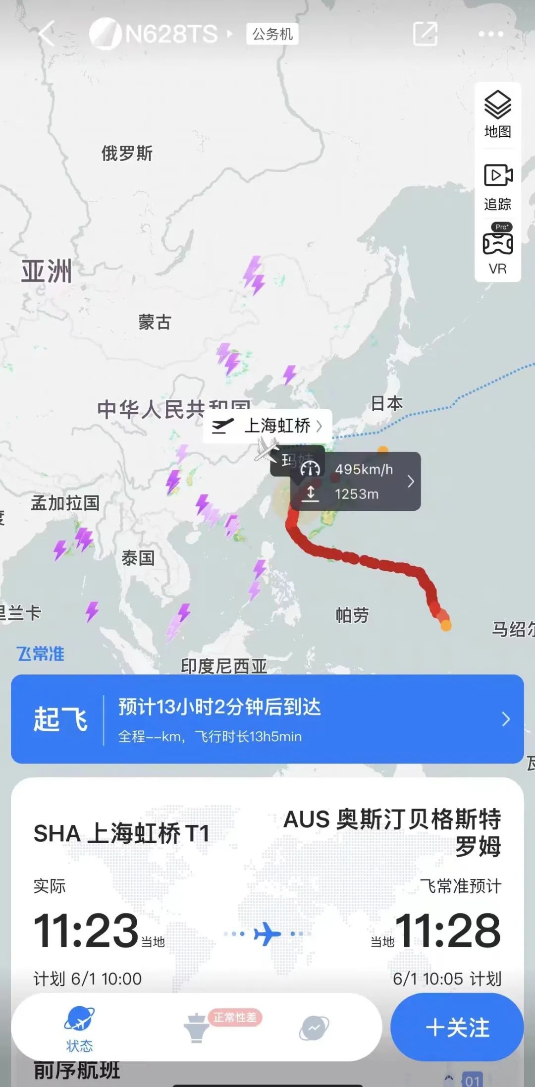 有知情人士告诉《中国企业家》,在上海匆匆一夜后,6月1日上午10点,马斯克从上海虹桥T1起飞,返回德克萨斯。据《中国企业家》了解,马斯克的航班出现延误,最终于11时23分起飞。