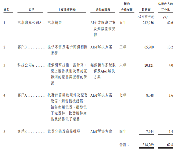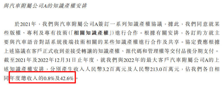 2021年出门问问跟一家汽车厂商达成了合作,以分享知识产权的方式获取收入,主要涉及的是语音对话系统的后端技术开发。仅这一个客户,在2022年为出门问问贡献了2.13亿元收入,占其年营收的42.6%。