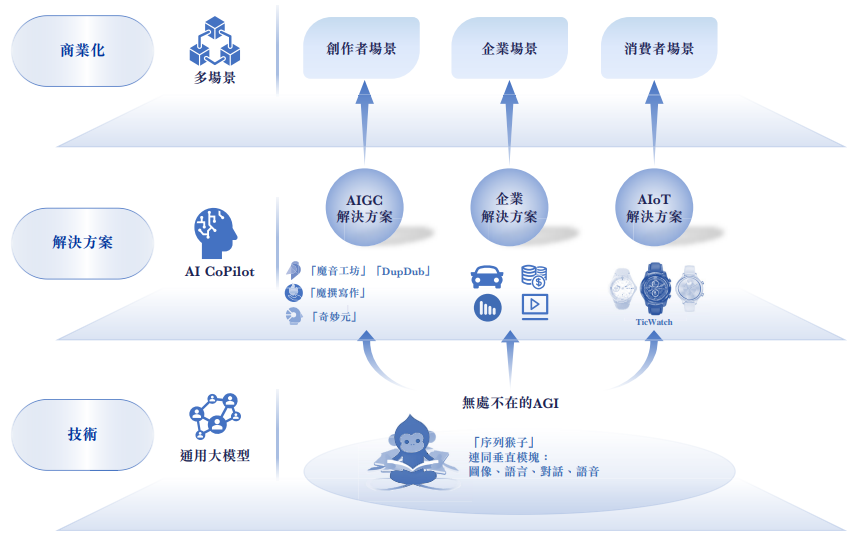 基本的逻辑是:研发以通用人工智能为核心的底层技术,然后基于这个技术底座推出各种解决方案,比如AIGC,最后找到具体的场景进行商业化落地。