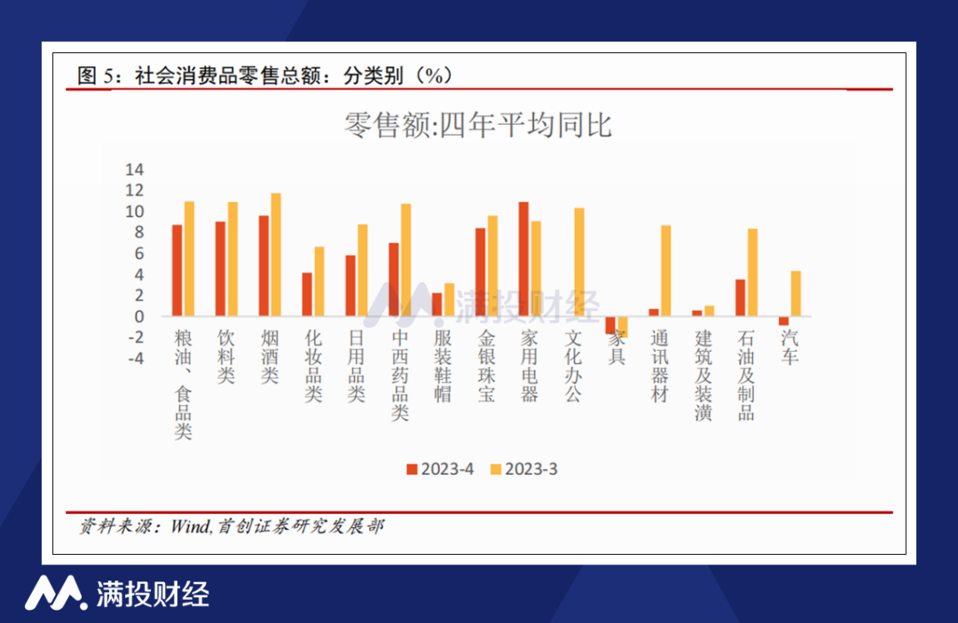 从社零数据来看,尽管3、4月份的服务业和消费品数据高于2022年平均水平,但放缓的趋势出现也令市场对后续的复苏并不是那么充满信心。除了家用电器和家电的平均同比有所好转外,其他分项均走弱,尤其是汽车由大幅正增长转为负增长,拖累较大。