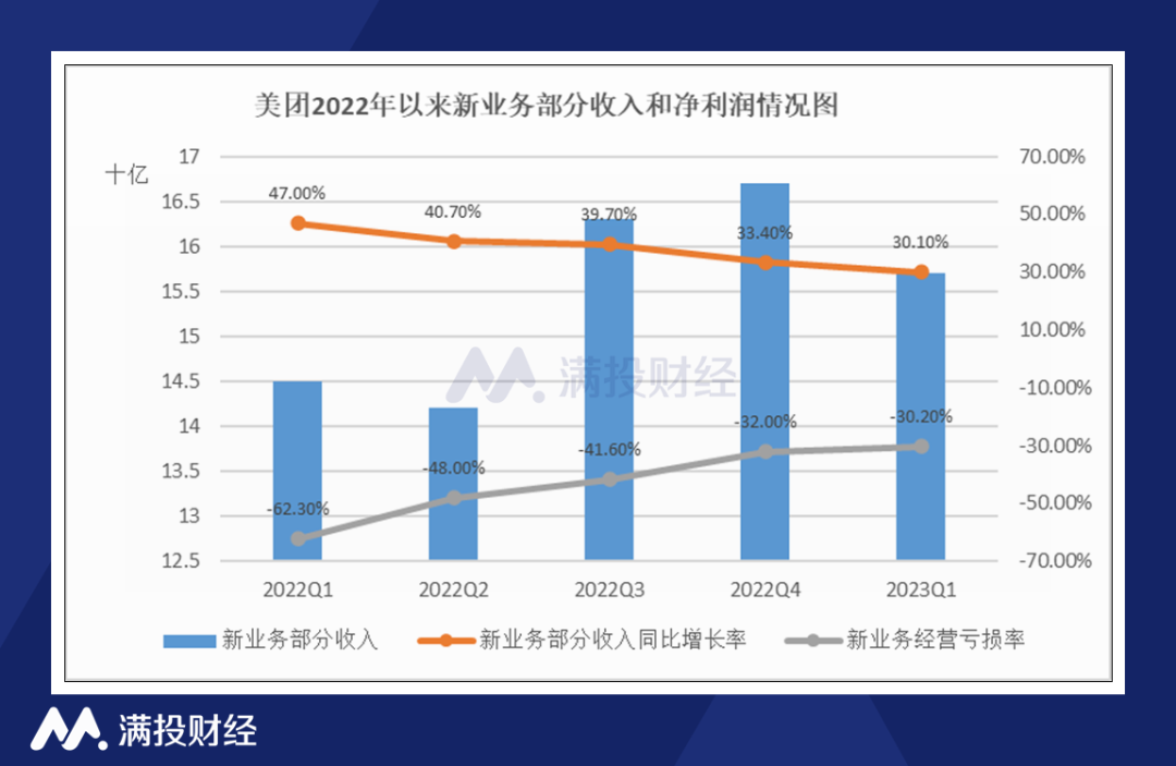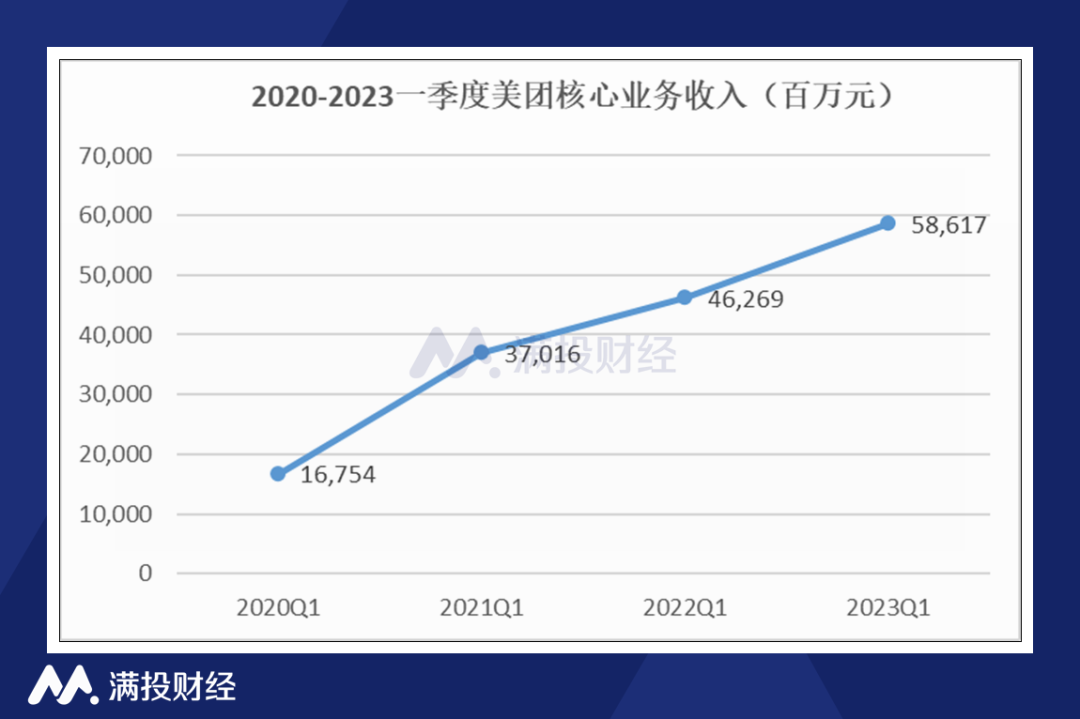 美团的核心业务是由外卖餐饮以及酒店旅游业务构成的核心本地商业业务。2023年一季度,美团核心本地商业分部收入由2022年第四季度的人民币435亿元减少1.4%至的人民币429亿元。