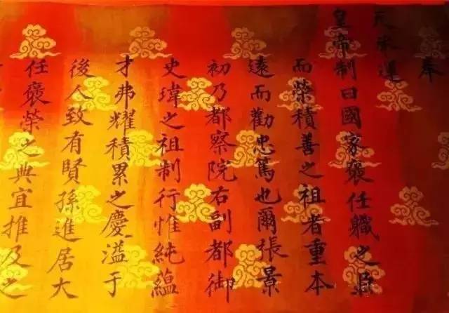 有些重要的圣旨还有另一个防伪绝招,圣旨的绢布上印满了祥云图案,就像今天的防伪水印一样,而且所有的圣旨开头的第一个字,必须是印在右上角第一朵祥云上。