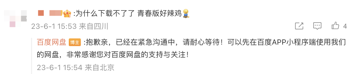 6月1日,百度网盘官方微博在评论区回复今日App在苹果应用商店下架一事:目前已紧急沟通中,可先在百度App小程序端使用网盘。